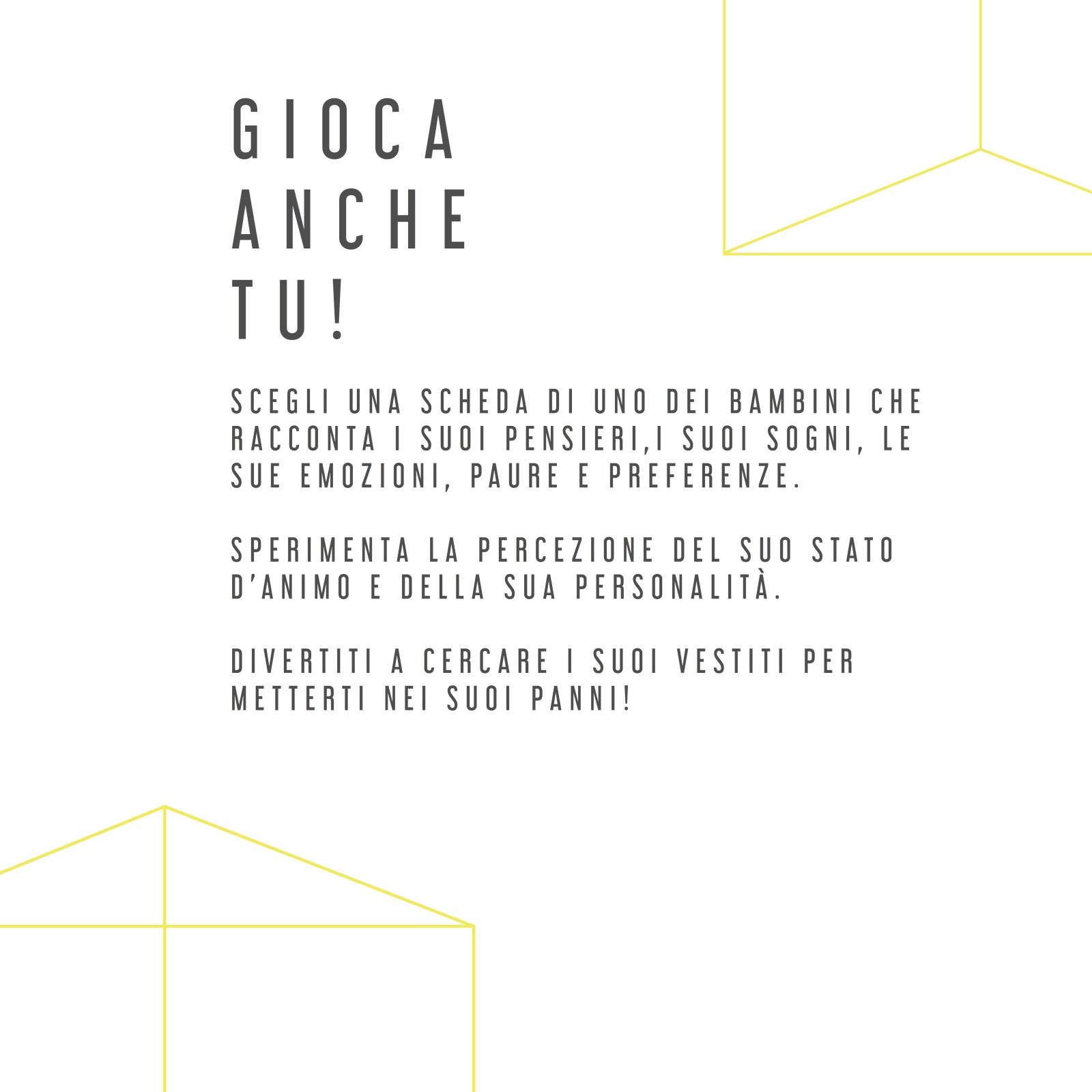 La mostra "Io, nei tuoi panni" esplora il concetto di empatia, invitando i visitatori, e in particolare i bambini, a mettersi nei panni degli altri per comprendere veramente ciò che provano. Attraverso un gioco coinvolgente, i bambini sono chiamati a trasformarsi nei panni di un altro, leggendo la sua storia, le sue preferenze e peculiarità. Il gioco diventa un'opportunità per sviluppare una comprensione profonda delle emozioni e delle esperienze altrui, promuovendo la solidarietà e il rispetto verso gli altri. Un’esperienza educativa che insegna a guardare il mondo con occhi diversi, arricchendo la propria capacità di ascoltare e comprendere.